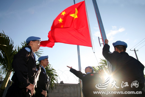 在維和期間,張偉保除了擔(dān)任防暴隊(duì)一分隊(duì)指導(dǎo)員,而且還是國旗手。今年2月1日,防暴隊(duì)去北京學(xué)習(xí)時(shí),觀摩了國旗護(hù)衛(wèi)隊(duì)升國旗的全過程,之后有幸將2月1日在天安門升起的國旗帶到海地。在防暴隊(duì)擔(dān)任國旗手的張偉保,在每個(gè)月的第一天以及國內(nèi)的重要節(jié)日里,他都要和兩名護(hù)旗兵一起,將中國國旗升起在海地的藍(lán)天下。“第一次將國旗在海地升起時(shí),心里有種說不出的激動(dòng)!睆垈ケUf。