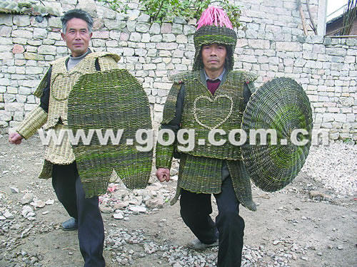 近日,被蜀國(guó)丞相諸葛亮用火燒死的藤甲兵在安順“復(fù)活”(如圖)。記者昨日在安順開發(fā)區(qū)歪寨村看見,該村村民根據(jù)老人的回憶復(fù)制的兩副藤甲已經(jīng)全部完成,村民穿在身上,活像三國(guó)時(shí)期曾大敗蜀軍的“藤甲兵”,令人驚奇不已。