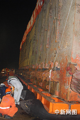 據(jù)介紹,今天適逢一個(gè)月內(nèi)潮位最高之日,本最有利于“南海一號(hào)”登陸。經(jīng)過(guò)今晚約兩個(gè)小時(shí)的努力,“南海一號(hào)”在甲板上被拖移了約十六米,但離碼頭尚有約八米。