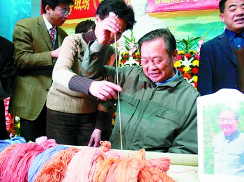 本報韶山訊(記者 劉炬 林俊 陳飛)昨日下午,《偉大領(lǐng)袖毛澤東》絨繡像啟繡儀式在韶山毛澤東同志紀念館舉行。毛澤東堂侄毛岸平在絨繡工藝師的指導(dǎo)下為繡像啟繡第一針。這件精美的手工藝品,將在明年毛澤東誕辰115周年時完成,屆時,它也將成為毛澤東文藝館落成后的首批展品。