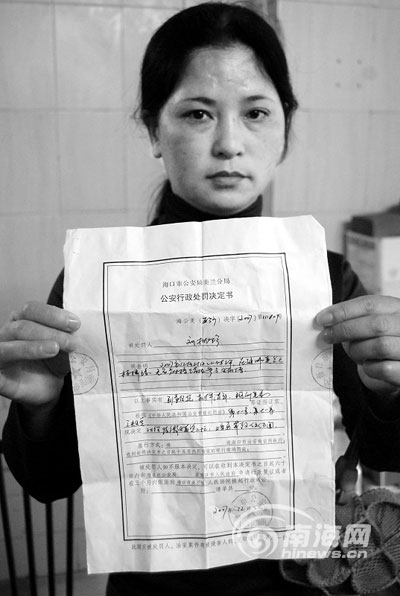 劉女士的“行政處罰決定書”這樣寫著,2007年12月21日22時(shí)許,在?诿捞m區(qū)板橋路無名麻將館內(nèi)參與賭博,根據(jù)治安管理處罰法規(guī)定,對(duì)你收繳賭資二十元,治安罰款伍百元。
