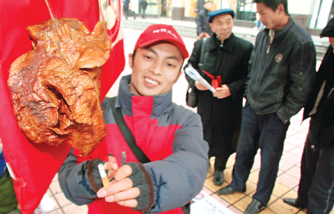 12月27日,長(zhǎng)沙市黃興南路步行街,張好記舉著禁煙宣傳牌,不時(shí)用點(diǎn)燃的香煙去熏掛在宣傳牌上又干又黑的豬肺實(shí)習(xí)生龔磊攝本報(bào)12月27日訊“希望這個(gè)被熏黑的豬肺能給‘煙民’敲響警鐘,讓他們滅掉手中的香煙。”今天上午,長(zhǎng)沙市黃興南路,來(lái)自瀏陽(yáng)的張好記舉著禁煙宣傳牌,不時(shí)用點(diǎn)燃的香煙去熏掛在宣傳牌上又干又黑的豬肺。