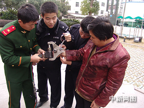 中新網(wǎng)溫嶺12月28日電(記者 柴燕菲 通訊員 陶文波 彭軍偉) 12月27日下午,溫嶺市新河派出所的民警帶著一位中年婦女來(lái)到溫嶺消防大隊(duì)救助,原來(lái)該中年婦女的右手腕被手拷牢牢拷住,民警用鑰匙以及其它方法嘗試都無(wú)法打開(kāi)。最后,在大家齊心協(xié)力的幫助下,巧妙的利用手動(dòng)液壓剪、鉗子等方法成功解救出了手腕。