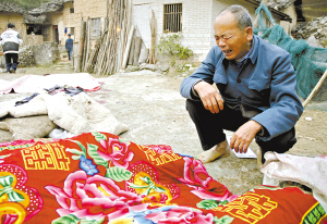 記者在一位老農(nóng)的指引下,才找到位于深山中的案發(fā)現(xiàn)場。清晨7時的深山很安靜,路邊的屋內(nèi)傳來一陣陣低沉的哭聲,草地上殘留大攤的血跡,似乎還沒有完全干涸。在瓦房對面的一個曬臺上,幾卷破舊的棉被和一堆雜亂的衣服中露出一只人腳,帶“喜”字的棉被下面蓋著尸體,現(xiàn)場沒有任何人看管,沒有警戒線,也沒有警車和警察,一切都顯得那么靜謐。