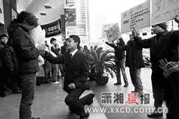據(jù)其中一名穿著筆挺的深藍(lán)色西裝、系著領(lǐng)帶的男子介紹,他叫卓曉勇,張家界人,今年29歲,在長沙五里牌一家公司做事。3年前,通過朋友介紹,他認(rèn)識了女友——中國移動(dòng)通信小吳門通信店的營業(yè)員郭彩霞,但雙方關(guān)系一直沒有到談婚論嫁的地步,由于父母親催得急,考慮到元旦是一元復(fù)始、萬象更新的日子,他想爭取在新年第一天,贏得芳心,抱得美人歸。