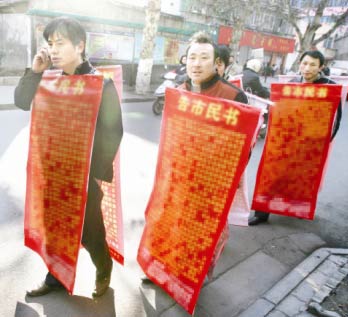 昨日上午,硚口區(qū)寶豐二路一居民樓下,5名農(nóng)民工身披“字書衣”討薪,引來眾多路人圍觀。記者近距離觀察,發(fā)現(xiàn)該“字書衣”由兩片長1.5米左右、寬0.5米左右的硬塑料布組成,記述了13名農(nóng)民工討薪三年以及被人持槍打傷的經(jīng)過,塑料布上還留有農(nóng)民工代表及包工頭的聯(lián)系方式。