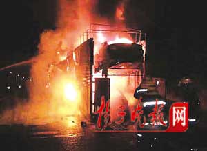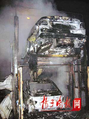 昨天(4日)凌晨時(shí)分,記者接到市民李先生報(bào)料后迅速驅(qū)車趕往現(xiàn)場(chǎng),過(guò)了機(jī)場(chǎng)高速翠屏山匝道口時(shí),已經(jīng)能聞到空氣中有一股濃濃的焦味。又開(kāi)了兩公里后,道路開(kāi)始擁堵起來(lái),不久車輛便完全停滯下來(lái),無(wú)奈之下記者只得棄車徒步趕往現(xiàn)場(chǎng)。直至兩公里開(kāi)外,終于看到了失火的運(yùn)輸車,只見(jiàn)運(yùn)輸車車廂已經(jīng)被濃煙籠罩,車廂里不停傳出“噼里啪啦”的爆響,從車廂縫隙處可見(jiàn)紅光閃閃。不一會(huì)兒,“砰砰”兩聲巨響傳出,車輪燒爆后炸破了車廂擋板。記者這才發(fā)現(xiàn)8輛寶馬轎車正在火籠中“煉獄”,輪胎、塑料部件已經(jīng)在燃燒,無(wú)人敢靠近。交警為防止車輛爆燃,危及過(guò)往車輛,封閉了所有往機(jī)場(chǎng)方向的入口,并對(duì)現(xiàn)場(chǎng)車輛和人員及時(shí)疏散。該運(yùn)輸車兩側(cè)油箱裝滿了柴油,火勢(shì)如無(wú)法得到有效控制,繼續(xù)下去,分為兩層擺放的轎車一旦轟然坍塌,恐怕會(huì)造成油箱爆炸。不久,又有兩輛大型消防車趕到現(xiàn)場(chǎng)增援。消防員冒險(xiǎn)撬開(kāi)車廂擋板,用5條水龍對(duì)火舌猛烈噴水。直至凌晨1點(diǎn)左右,火勢(shì)才被完全控制,但總價(jià)值400多萬(wàn)的4輛寶馬5系和4輛寶馬3系轎車幾乎成了一堆廢鐵。