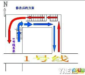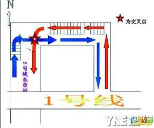 為了讓大家能對這一問題有直觀的認識,“cjg9527s”制作了兩張圖發(fā)在網(wǎng)上。第一張圖是目前東單地鐵站換乘通道的設(shè)計圖,另外一張則是他修改之后的東單地鐵站換乘通道的通行圖。第一張圖上可以清晰地看到,由于從1號線通往5號線的兩部電梯和從5號線通往1號線的扶梯設(shè)置在靠墻的同一側(cè),所以兩股換乘人流勢必會在5號線進站口附近交叉。