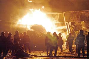 昨晚9點(diǎn)30分左右,一輛油罐車在順義區(qū)李橋鎮(zhèn)后橋村一加油站附近碰撞一輛集裝箱貨車。事故引發(fā)一場(chǎng)大火、多次爆炸。順義區(qū)6個(gè)消防隊(duì)參與滅火,至昨晚11點(diǎn)45分,大火被撲滅。油罐車中一人喪生,警方緊急疏散附近百余名村民。