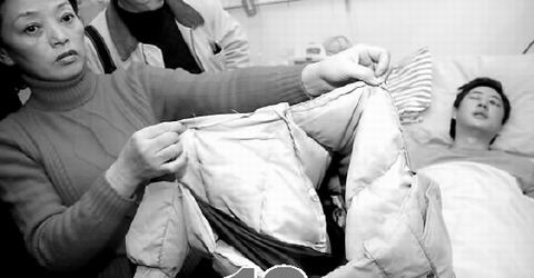 媽媽從床邊拿起一件乳白色羽絨衣,上面滿是腳印,已被撕扯得破爛不堪。“當(dāng)時(shí),我兒子就是穿著這件羽絨衣去采訪,事情發(fā)生后,三四個(gè)人沖上來(lái)?yè)寯z像機(jī),我兒子把攝像機(jī)藏在羽絨服里,那些人搶不到機(jī)器,對(duì)他拳打腳踢,他的背上全是腳。 痹捨凑f(shuō)完,媽媽就泣不成聲了。爸爸憐愛(ài)地注視著兒子,默默無(wú)言……