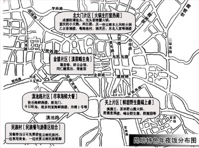 北大門區(qū)域的品牌火鍋最為集中,成都的譚魚頭、光頭香辣蟹火鍋,重慶的小天鵝、兩江樓檔次高、口感好、環(huán)境好、服務(wù)好。此外,這個區(qū)域的酒樓風(fēng)格最豐富,乙古香酒樓(滇味精品家宴)、粵海漁村(老牌平價海鮮酒樓)、酒靈莊(騰沖風(fēng)味)、東北人家(東北風(fēng)味)等等,不同的風(fēng)味,可讓你吃不膩。10人桌收費標(biāo)準(zhǔn)視實際菜品確定,人均消費30-80元。