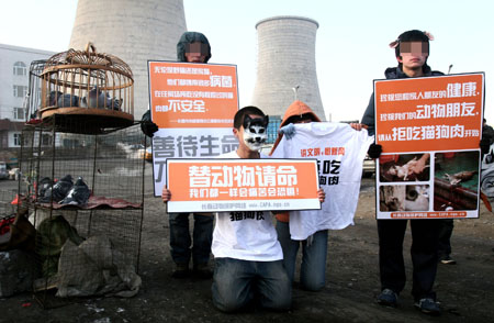 一名大學(xué)生穿著短袖,頭上戴著“貓咪”面具,身前放著一個“替動物請命”的牌子跪在馬路上,一個女孩舉著印有“拒吃貓狗肉”的T恤衫跪在他旁邊。他們身后,幾名學(xué)生拿著“善待生命、刀下留情”的廣告牌陪同,學(xué)生們在瑟瑟的寒風(fēng)中“為動物請命”,這是昨日發(fā)生在鴿子市場的一幕。他們希望用這種方式感染那些虐殺動物的商販,讓商販們放下“屠刀”、珍愛生命。
