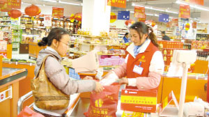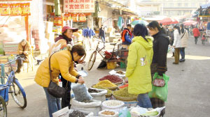 農(nóng)貿(mào)市場(chǎng)上小商販用編織袋給消費(fèi)者裝東西
