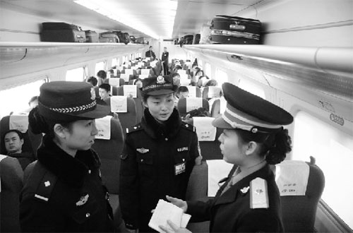 一輛動車組安排兩名女警。也就是說,一人要負(fù)責(zé)600余名乘客的安全,這些剛出道的姑娘能行嗎?記者提出了擔(dān)心?沈陽乘警支隊支隊長戴洪厚專門找來了4名最早上動車組執(zhí)勤的女警做釋疑。