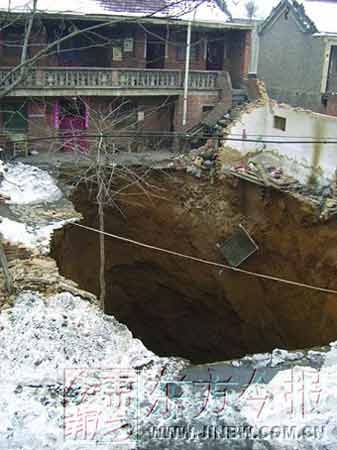 一個深20多米、直徑20多米的洞口,赫然就在村路上。洞口的民房,大門圍墻和廚房還有樓梯間都沒了,只留下東面一面墻!爱(dāng)時我們還以為是地震呢!贝罂幽厦娴拿穹侩m未受損,但住路北的王女士提起這件事仍心有余悸。王女士說,21日天黑時,就聽到有響動,聲音像刮大風(fēng)。再后來,房子的窗戶玻璃一會兒一抖,家里的燈泡也開始晃。“也記不清啥時候,就聽到一聲悶響,開門一看,對面住的人慌著往外翻墻,有的只穿條秋褲!沒多大會兒,剛翻過的墻就開口了,接著塌陷了……”