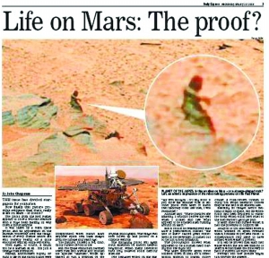 這張令人驚訝的火星照片顯示,在紅色星球的一處山坡上,一個腦袋碩大、如同“大腳怪”的黑色身影正揮著手臂走下火星山坡,它看起來又像是正坐在一塊石頭上休憩,還有人稱,照片上的“火星人”看起來像是一名女性。針對這幅“火星人”照片,英國《每日郵報》幽默地評論說:“她坐在一塊巖石上,像在等一輛公共汽車,不過如果真是這樣的話,她可能得面臨永無止境的漫長等待。”《泰晤士報》則將這個“火星人”比喻成是藏得無影無蹤的本·拉丹:“它是一塊巖石,還是火星光線的錯覺?或者是本·拉丹在遠(yuǎn)離地球3億英里遠(yuǎn)的荒蕪藏身處朝地球揮手?”