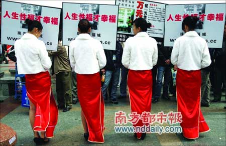 一名男子花800元,請四名靚女舉著“萬元紅包征‘無性!蓛骸钡呐谱,在華強北征經(jīng)濟條件差且無能力娶老婆的人。如果條件符合,決定花一萬元幫助無力娶妻的男人娶回老婆,并考慮幫助其解決工作問題。