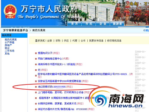 (海南)萬寧市政府人民網(wǎng)站居然有迷幻藥的供求信息”。今日下午5時許,一網(wǎng)友向本網(wǎng)來電稱。記者立即打開萬寧市人民政府的網(wǎng)站,驗(yàn)實(shí)了該網(wǎng)友報料的真實(shí)性。