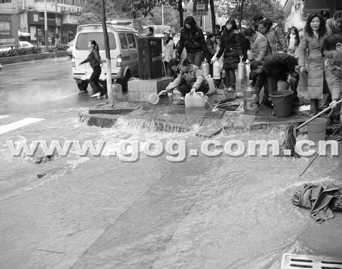 上午11點左右,記者聞訊趕到現(xiàn)場時,看見附近的居民正挑著水桶、抬著臉盆,提著礦泉水桶守在爆裂的水管處接水。忙著接水的王先生頭也沒抬地告訴記者:“突然停水,沒準(zhǔn)備。得抓緊接點水!