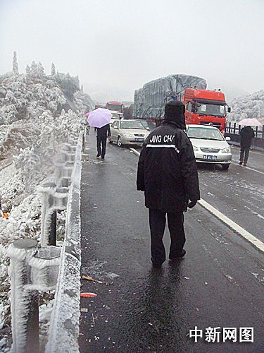 強(qiáng)冷空氣繼續(xù)肆虐,橫掃粵北山區(qū),京珠高速公路廣東韶關(guān)段(即廣東京珠北)路面出現(xiàn)大面積結(jié)冰,造成南北交通完全中斷,當(dāng)?shù)馗咚俟方痪嚷毮懿块T全力疏導(dǎo),但由于結(jié)冰現(xiàn)象不斷加劇,大批車輛被滯留在高寒路段。