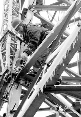 接替丁潤國這班的就是送飯來的12個(gè)人。他們系著安全帶,從塔底端一個(gè)接一個(gè)地爬上鐵塔,到達(dá)塔頂后,把塔下的鋼材用繩索運(yùn)上并固定。鐵塔上有很多厚重的覆冰,電線上的冰直徑達(dá)十多厘米。
