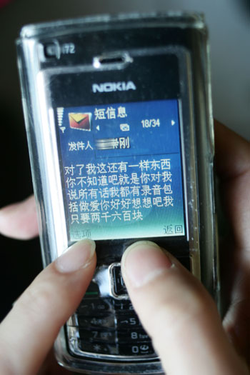 1月28日,麗娜的手機(jī)突然收到了一條短信:“我這有一樣你的東西,你不知道吧?就是你對我說的所有話我都有錄音和視頻,包括咱們在一起××,你好好想想吧!我只要2600塊錢!丙惸瓤吹竭@則短信后非常害怕,就打電話給王剛,希望他不要有過激行為,但王剛說如果不給錢,就讓全世界都知道麗娜的“丑事”。
