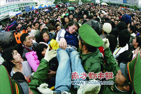 廣州火車站廣場,一位暈倒的旅客被接力式從等待進(jìn)站的人群中送出,武警隨后將她抬至正對著火車站進(jìn)站大廳的臨時醫(yī)療中心。張駿攝