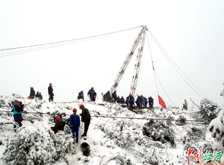 隨著災(zāi)情的進一步加劇,萍鄉(xiāng)市人民政府在當(dāng)日下午18時隨即啟動了大面積停電事故應(yīng)急預(yù)案Ⅰ級響應(yīng),市委書記謝亦森、市長曾慶紅等市領(lǐng)導(dǎo)先后來到萍鄉(xiāng)供電公司,了解指導(dǎo)電網(wǎng)抗冰搶險與電力供應(yīng)保障工作。供電部門也加緊了對受損電網(wǎng)的搶修。萍鄉(xiāng)巨大的災(zāi)情引起了省電力公司的高度重視。1月25日,省電力公司總工程師譚永香親臨萍鄉(xiāng),深入蓮花縣現(xiàn)場視察災(zāi)情,指導(dǎo)萍鄉(xiāng)供電公司做好抗冰搶險保供電工作;1月30日,省電力公司黨組書記、總經(jīng)理毛日峰又委派了省電力公司副總經(jīng)理肖黎春火速趕往萍鄉(xiāng),坐鎮(zhèn)指揮和督導(dǎo);在1月24日調(diào)集了省水電工程局和武警水電總隊共180余名增援隊伍后,1月30日,省電力公司又調(diào)集贛州供電公司近30名精兵強將強力增援萍鄉(xiāng)。至此,加上萍鄉(xiāng)供電公司和贛萍公司的搶修人員,一共有近3000名電力員工投入到萍鄉(xiāng)電網(wǎng)抗冰保供電中。