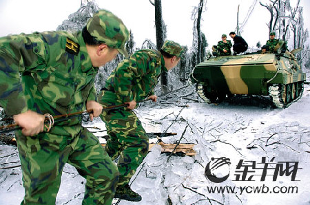 如位于位于粵湘交界處廣東第一峰大東山半山腰的星子鎮(zhèn)潭嶺村,通往山下的唯一一條12公里水泥路結(jié)上了十多厘米厚的冰層,4000多村民被困在山上,由于停電,碾米機(jī)無(wú)法運(yùn)轉(zhuǎn),村民的籌備糧很快吃光,連喂豬的飼料都要吃光了,已經(jīng)陷入絕境。得悉這種情況后,廣州軍區(qū)某部緊急派出官兵和兩輛裝甲運(yùn)輸車以及推土機(jī)、大卡車等奔赴受災(zāi)山區(qū),一路上,領(lǐng)導(dǎo)帶頭揮舞榔頭、鐵鏟奮力破冰開(kāi)路,協(xié)助連州當(dāng)?shù)卣岩慌竺、棉被、柴油碾米機(jī)等救援物資迅速送到受困群眾手中。(記者 覃明章 記者 黃瓊 尹政軍 通訊員 楊小剛 鄒庭松 陳楚然 韓志軍/攝影)