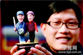 喜劇明星趙本山和宋丹丹今年春晚合演的《火炬手》那對可愛的東北老頭老太形象給觀眾再次留下了深刻的印象。這不,昨天,南京一位巧手的市民陸文著在民俗手工藝表演展示會上,用面捏出了“白云和黑土”,將戴著標(biāo)志性藍(lán)色八角帽的趙本山以及豁牙卻自信的宋丹丹塑造得惟妙惟肖,再添上一旁的奧運(yùn)火炬“筋斗云”做道具——讓人忍俊不禁。