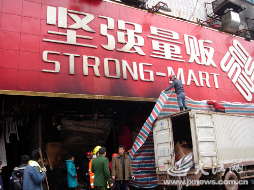 2月6日晚,南康市堅強量販一連鎖超市濃煙滾滾,100多戶住戶被濃煙包圍,大火燒了7個小時才得以控制,超市一名20多歲的保安喪生。