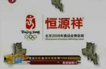 春節(jié)期間,中央電視臺、東方衛(wèi)視、湖南衛(wèi)視等播出恒源祥集團(tuán)的賀歲形象廣告。廣告中,低沉的男聲反復(fù)12遍“恒源祥,北京奧運(yùn)會贊助商!蓖暷畛龅氖っQ穿插其間,從“鼠鼠鼠”、“牛牛牛”,直到“豬豬豬”。廣告畫面以奧運(yùn)中國印和恒源祥商標(biāo)為底,十二生肖的卡通圖案依次閃過。廣告時長1分鐘。