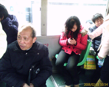 “雖然這樣,但該女子假裝沒(méi)有聽(tīng)見(jiàn),依舊坐在那里發(fā)她的短信,我抱著孩子在其旁邊站了一會(huì),該女子還是依然如故,好在很快有人下車(chē)了!本W(wǎng)民“techuen333666”說(shuō),于是,他抱著孩子坐在駕駛員后面的工具箱上,用手機(jī)給那個(gè)搶座的女子拍了照片。