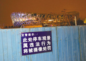 “此處停車觀景屬違法行為,將被攝像處罰”。隨著奧運會的日漸臨近,“鳥巢”、“水立方”逐漸成為了奧運熱門景點,北辰橋上每天有眾多游客停車拍照。為此,交管部門在橋上設(shè)立交通警示牌,告誡司機停車拍照將受處罰。