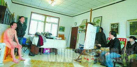 下午5時,畫室里一臺柜式空調和一個1500瓦的電熱器已經(jīng)給60來平米的畫室加熱了兩個小時。準備就緒,萬老師開始調試畫筆和觀看角度。楊曉勇忙著把唯一的一臺電熱器放在父親一側,然后靜靜地站在父親身旁。而父親完全沒把現(xiàn)場的三個男人和“編外”女學生放在眼里,微笑著脫掉粗布外套,再一把翻起其余的毛線衣和內衣,頭一縮就全脫了下來。楊師傅一邊說一邊熟練地去掉內外褲,時間不過5秒鐘。看著身旁一絲不掛的父親,不用脫衣(作品需要)的楊曉勇眼睛一紅,迅速將頭仰向天花板,生怕眼淚掉下來。畫家被眼前父子倆的舉動感動了,他拿起了畫筆。一筆一畫,現(xiàn)實中的楊師傅父子走進了畫布。