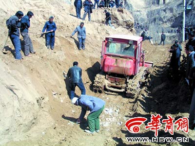 ”昨日中午12時(shí),在場(chǎng)指揮的子洲縣委書記雒鳳翔介紹說。救援現(xiàn)場(chǎng)一輛推土機(jī)正在推走從30米高崖上墜落的土方,七八名鄉(xiāng)親用大鋤頭正在挖土搜救被埋人員,120急救人員、縣醫(yī)院醫(yī)生在此等候救治傷員。