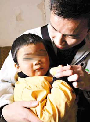 放好摩托車后,劉大毛便四處張望。當(dāng)他看到注視著他的記者一行時(shí),馬上拖起男孩子的手,笑嘻嘻地迎了上前。沒等仔仔介紹完隨行兩人的關(guān)系,女記者便已經(jīng)彎下身去逗小男孩?墒钱(dāng)她準(zhǔn)備抱他時(shí),孩子馬上大哭起來,轉(zhuǎn)過身去,雙手緊緊地抱著劉大毛的右腿不放。在劉大毛的幫忙下,女記者才勉強(qiáng)抱起了男孩,但他依然哭個(gè)不停。