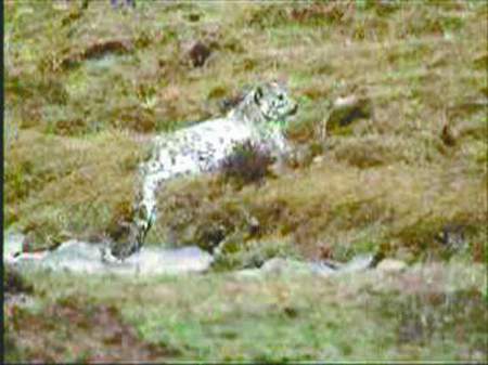 目的地距離真達(dá)鄉(xiāng)政府有四五十公里,海拔為3900米~4000米,汽車并不能直達(dá),在換乘了摩托車和馬,又步行了一段路后,一行人果然有重大收獲:大老遠(yuǎn),他們就看見一只雪豹趴在溝邊,借著三四十厘米高灌木的掩護(hù),他們悄悄往溝邊挪去。這只雪豹身長一米多,由于距離太遠(yuǎn),相機(jī)幾乎不能發(fā)揮作用,黃勇便接過DV,將鏡頭對準(zhǔn)它,拉近、再拉近……“最近時,我們和它相距只有十多米,”黃勇說,當(dāng)時他們心里發(fā)虛,好在周圍有羊的尸體,估計(jì)雪豹剛填飽了肚子,而且它在起身離開的途中,遭遇了三頭牦牛的圍攻,旁邊還有一群馬,“馬也在攆它”。雪豹雖然早就發(fā)現(xiàn)有人一路跟隨,但無暇顧及。由于寡不敵眾,雪豹?dú)獯跤醯財∠玛,悻悻地向海拔更高的地方走去,“別看它并沒有跑,我們跟在后面卻是累得夠嗆!