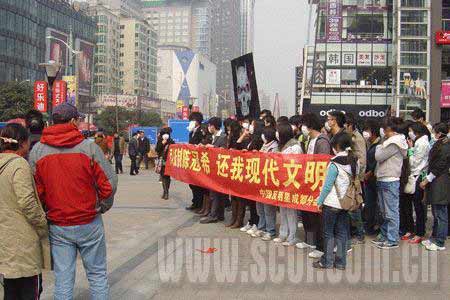 昨日下午,一聲聲“抵制陳冠希,還我現(xiàn)代文明!”的口號從(成都)香檳廣場傳來,吸引了大批市民圍觀。50多個戴著白口罩的年輕人在廣場上整齊地排成幾排,站在第一排的年輕人還拉起一條10多米長的“萬人抵制陳冠希,還我現(xiàn)代文明”紅色橫幅。在喊口號的同時,還不時有人在橫幅簽名。這群年輕人正是“中國反明星成都分會”的會員,正在搞一個“反對明星萬人大簽名”的活動。據(jù)了解,這次活動是今年全國“反明星”活動的“開幕戰(zhàn)”,隨后,全國各地都將舉行各種“反明星”活動。他們稱,一旦有“明星大事”發(fā)生,他們就將隨時“公開抗擊”。