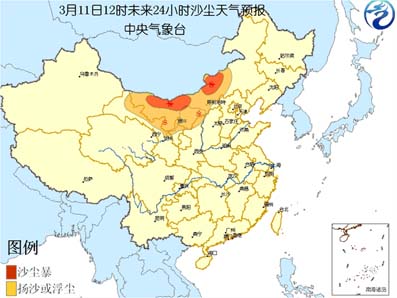 中新網(wǎng)3月11日電 中央氣象臺(tái)今天上午十時(shí)繼續(xù)發(fā)布沙塵天氣預(yù)報(bào):受東移冷空氣影響,預(yù)計(jì)今天中午到明天中午,甘肅河西走廊、內(nèi)蒙古中西部、寧夏北部、陜西北部等地有揚(yáng)沙或浮塵天氣,內(nèi)蒙古中西部偏北的部分地區(qū)有能見(jiàn)度小于1000米的沙塵暴。