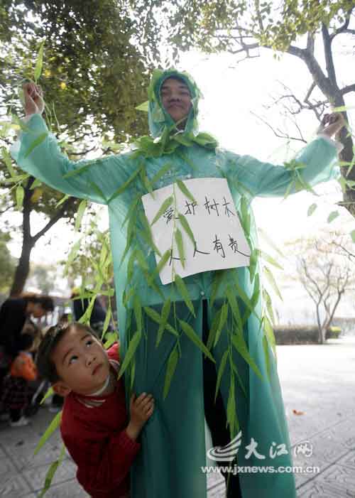 據(jù)了解,這群青年志愿者希望通過(guò)行為藝術(shù),呼吁人們保護(hù)植物,愛護(hù)環(huán)境。他們從頭到腳用綠色塑料雨衣和塑料花、塑料枝葉裝扮成大樹和花朵。組織者告訴記者,全球環(huán)境變得越來(lái)越惡劣,如果大家不愛護(hù)樹木,將來(lái)人類只能用塑料花、塑料樹來(lái)替代。(李偉 梁冰 李慧)