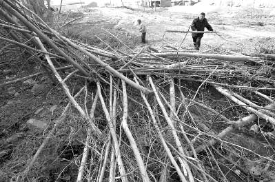 昨日下午2時(shí),記者聞?dòng)崄?lái)到現(xiàn)場(chǎng)時(shí),陳保民和母親、妻子正在被夷為平地的林地里整理?xiàng)顦?shù)的“斷臂殘肢”。“好好的一片樹(shù)林,一會(huì)兒工夫,啥都沒(méi)有了,造孽!”70歲的陳母抱著一把新鮮的楊樹(shù)枝,泣不成聲。