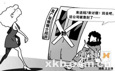 昨天下午,此前被媒體曝光騙取了多名想嫁洋老公的女子會費的“無良婚介”廣州易廣聯(lián)婚姻咨詢公司,被廣州市工商局海珠分局等部門查封。據(jù)悉,根據(jù)《公司法》、《國務(wù)院辦公廳關(guān)于加強(qiáng)涉外婚姻介紹管理的通知》等條例的規(guī)定,易廣聯(lián)婚姻咨詢有限公司涉外婚姻介紹屬非法經(jīng)營,相關(guān)責(zé)任人將要受到刑事拘留。