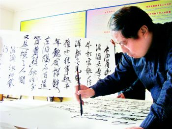昨天,記者在延慶縣延慶鎮(zhèn)米家堡村見到了49歲的張海河。操著濃重延慶口音的他告訴記者:“我只有初中文化,識字不多,先是種地,后又做建筑安裝,沒想到老了老了,還能練書法,讓鄉(xiāng)親們覺得我是個文化人!”