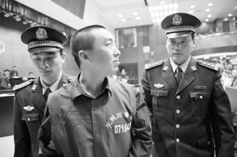 下午3時(shí)10分,待法庭書記員宣讀完法庭紀(jì)律后,宣判開始了。在三百多雙眼睛的注視下,在上百臺(tái)照相機(jī)、攝像機(jī)的聚焦下,許霆被法警押上了被告席。穿著天看(天河區(qū)看守所)1643號(hào)藍(lán)色看守服的許霆,臉上還是那么白,還是那么鎮(zhèn)定。法警解開手銬后,他端坐在法庭被告席上,雙手分開緊緊地貼在了膝蓋上。負(fù)責(zé)該案的審判長開始宣讀審判書,許霆始終目不轉(zhuǎn)睛地緊盯著他。