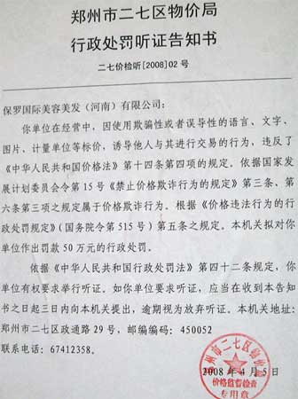 告知書上稱,“你單位在經(jīng)營(yíng)中,因使用欺騙性或者誤導(dǎo)性的語言、文字、圖片、計(jì)量單位等標(biāo)價(jià),誘導(dǎo)他人進(jìn)行交易的行為,違反了《價(jià)格法》第十四條第四項(xiàng)的規(guī)定,屬于價(jià)格欺詐行為……本機(jī)關(guān)擬對(duì)你單位作出罰款50萬元的行政處罰。”
