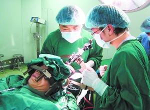 3月21日上午,醫(yī)生給陳先生戴上一個球形坐標定位框,通過探測患者的腦電波,在專業(yè)儀器上給患者的大腦建立一個三維矩陣,“就像衛(wèi)星導航定位一樣,人腦中的每一個部位就都具有了一個明確的坐標”。之后,醫(yī)生又對患者的大腦進行薄層高清晰度掃描,進一步顯示患者腦內(nèi)的各種結(jié)構(gòu)。然后利用這種掃描的圖像,根據(jù)醫(yī)生的臨床經(jīng)驗,從解剖結(jié)構(gòu)上確認患者大腦內(nèi)需要安放電極核塊的靶點坐標。