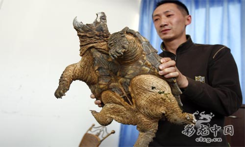 記者隨后從網(wǎng)上查找了一些相關(guān)的資料,發(fā)現(xiàn)這個“怪物”有點像麟角鱷龜!肮治铩本烤故遣皇谴篦{龜,還有待于專家的鑒定。