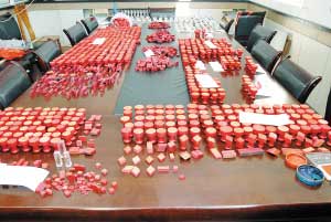 前日晚10時(shí),公安南開分局治安科、王頂?shù)膛沙鏊、萬(wàn)興派出所采取聯(lián)合行動(dòng),對(duì)華章里張某的暫住地實(shí)施突擊清查。張某絲毫沒有料到警察會(huì)深夜光臨,聽到敲門聲還以為有客前來(lái)取證便打開了房門。民警立即將其控制住并迅速?zèng)_入屋內(nèi),只見其外甥女王某正坐在里屋電腦前認(rèn)真制作一份高校畢業(yè)證書,桌上還散亂地?cái)[放著許多打印出來(lái)的半成品。經(jīng)過(guò)對(duì)室內(nèi)細(xì)致搜查,民警先后從衣柜、抽屜及床下分別搜出用來(lái)制販假證的偽造的各部門公章、鋼印印模1000多枚,不僅全國(guó)各大名牌高校的公章及校長(zhǎng)名章一應(yīng)俱全,還有各種行政事業(yè)機(jī)關(guān)部門的公章,甚至還有公安機(jī)關(guān)基層派出所的戶籍專用章及民警名章。同時(shí)還搜出大量空白假證半成品3000多冊(cè),既有各種畢業(yè)文憑,也有各部門資質(zhì)證書,其中包括已經(jīng)制作好的各類假證10余件。