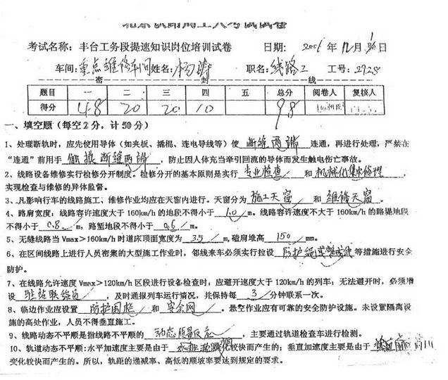 一審過(guò)程中,北京市鐵路局提供了一份試卷,法院據(jù)此認(rèn)定“從其工作狀態(tài)及崗位培訓(xùn)考試成績(jī)來(lái)看,其智力、精神狀況未受影響!睂(duì)于法院用一份試卷否定司法精神醫(yī)學(xué)鑒定結(jié)論,黃樂(lè)平律師難以理解:“在一審中,楊濤的親屬多次否認(rèn)單位遞交的試卷的真實(shí)性,并向法院遞交了楊濤的筆跡,以供一審法院查明事實(shí)。但是,法院最終還是憑這份有偽造嫌疑的試卷,推翻專(zhuān)業(yè)司法鑒定機(jī)構(gòu)所作的司法精神鑒定。”